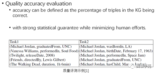 知识图谱构建完成之后,需要对构建的质量进行评测,准确率可以定义为知识图谱中正确的三元组的比例,当前的质量评测通常还是通过人工的方式进行。因此,如何保证评测可信度的前提下最大限度的降低人工的成本是十分重要的任务。对于一个人同样是查验5条三元组,如果数据的呈现方式不同,最终所花费的代价也可能不同。例如,上图中左侧的三元组由于涉及到了不同实体,而右侧的三元组涉及的是同一个实体,很明显,查验右侧的数据所耗费的时间更少。VLDB 2019的文章【1】对这个问题做了深入细致的研究。