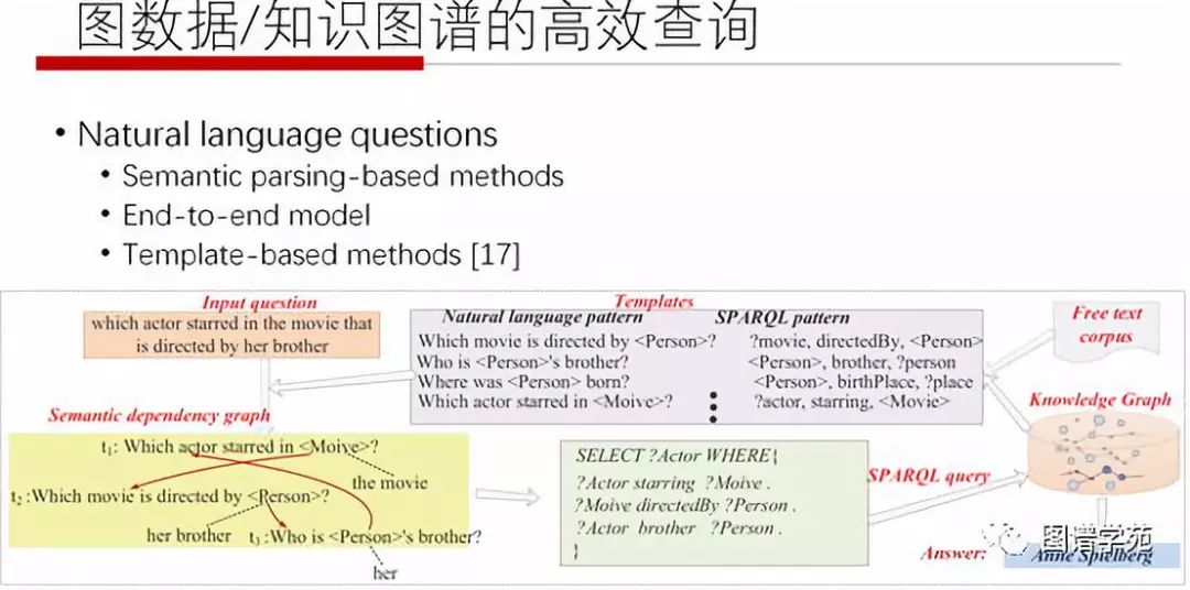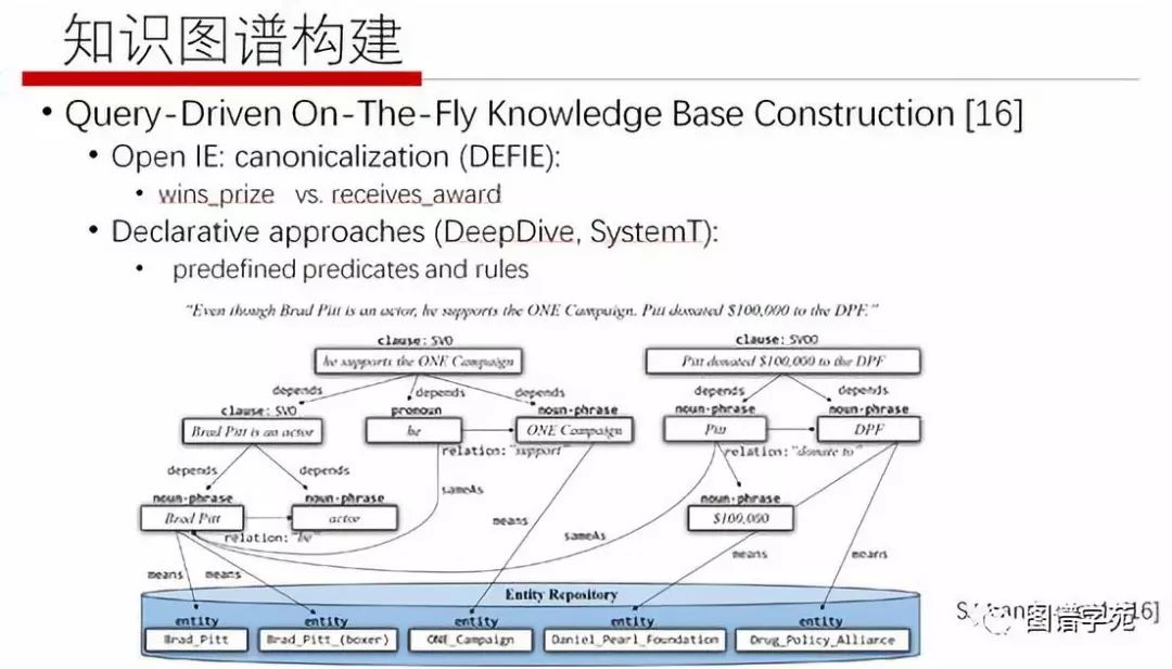 VLDB 2018有研究人员提出了一种在线构建知识图谱的方法【16】,当用户给定了一个查询之后,系统检索到包含查询的自然语言文本,然后进行在线解析,生成结构化的知识图谱。作者构建了一个语义图(semantic graph),包括句子中的短语以及短语之间的依赖关系,同时还包含了短语到已有的知识图谱的(例如DBpedia)的链接关系。基于语义图进行最终的图谱抽取,同时也可以解决了知识图谱的标准化问题。