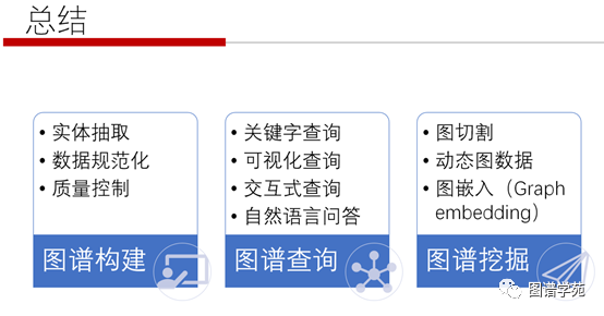 知识图谱作为图数据的一种,目前主要关注三个相关的研究问题,分别是知识图谱构建、知识图谱查询、知识图谱挖掘,以下将从这三个方面分别进行介绍。注意到本文不是专门介绍某一篇文章,而是对相关的研究进行梳理,旨在介绍不同的关注点上的研究进展。