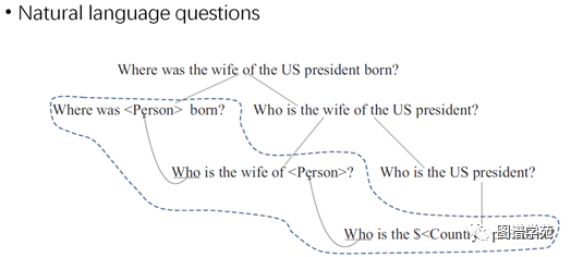 例如,问句“where was the wife of the USpresident born?”可以拆解成3个简单模板,并且这三个模板之间具有依赖关系。然而对于一个复杂问句,设计一个有效的拆解算法具有一定的挑战。文献【17】给出了一个高效的拆解方案。
