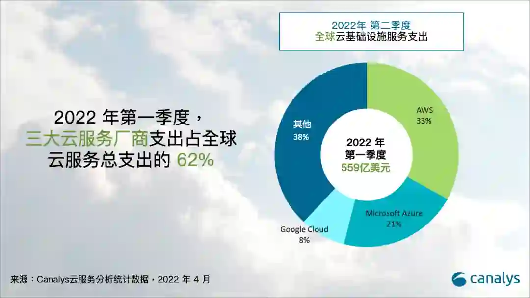 Canalys最新数据显示,2022年第一季度,全球云基础设施服务支出同比增长34%,达到559亿美元。亚马逊网络服务、微软Microsoft Azure和谷歌云位列前三,总支出占全球用户支出的62%,同比增长42%。(IT之家)