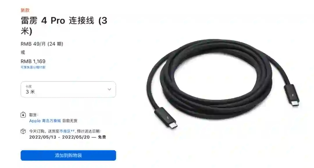 【苹果开卖3米长雷雳4 Pro连接线,售价1169 元】