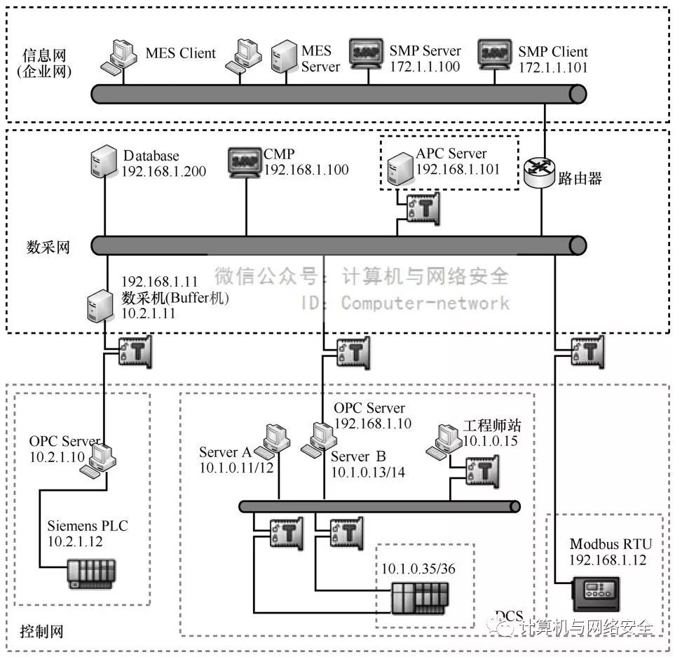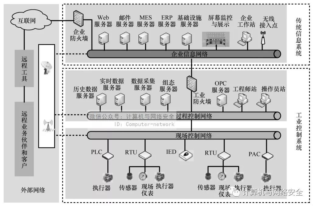 从体系架构上看,传统信息系统是通过互联网协议组成的计算机网络;而工业控制系统是PLC、RTU、DCS、SCADA等工业控制设备及系统组成的多层次网络。