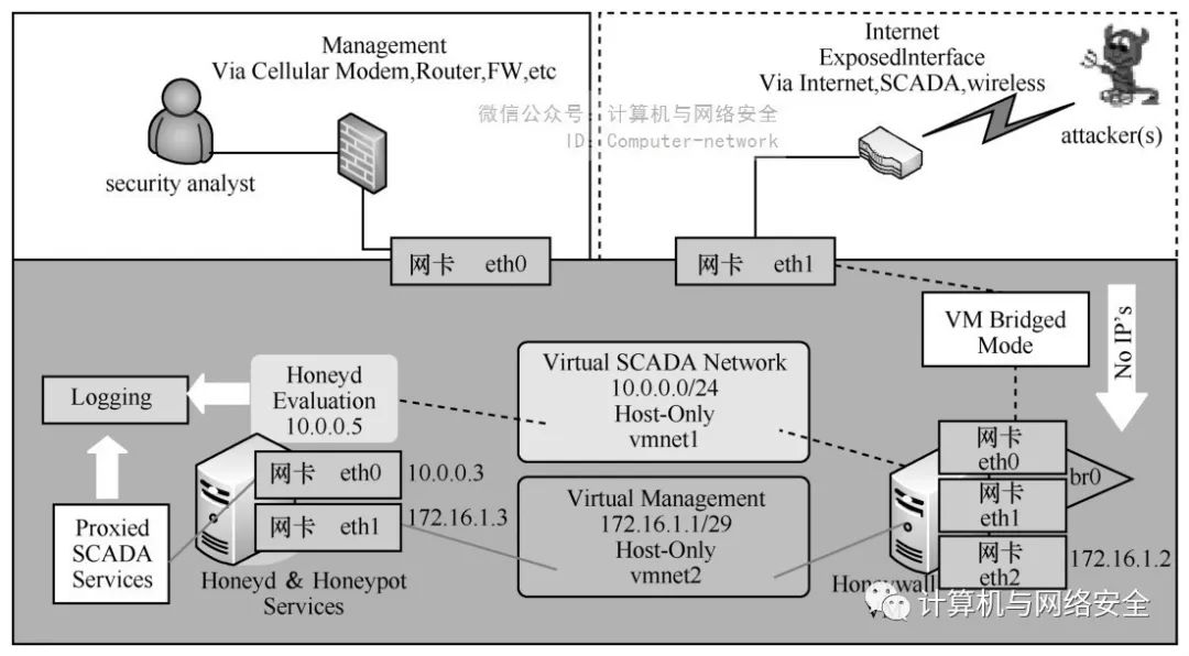 由于在蜜罐构建中,许多资产所有者希望可以用他们自己的现场设备替换模拟PLC。因此,Digital Bond在SCADA Honeynet的基础上,推出了修改版本SCADA Honeywall,它可以允许一个真实的PLC或者其他的控制系统组件替换图3中的模拟PLC。
