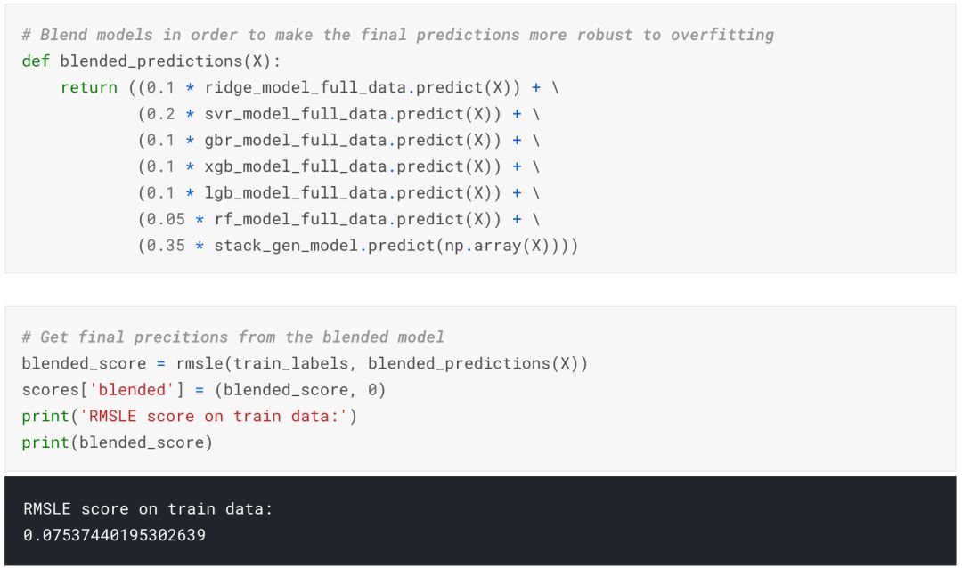 从上图中我们可以看出,混合模型的RMSLE为0.075,远远优于其他模型。这是我用来做最终预测的模型。