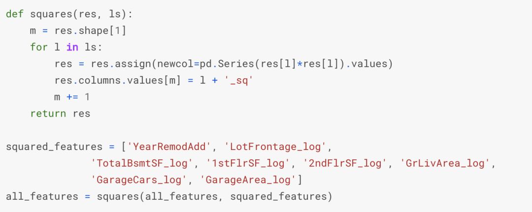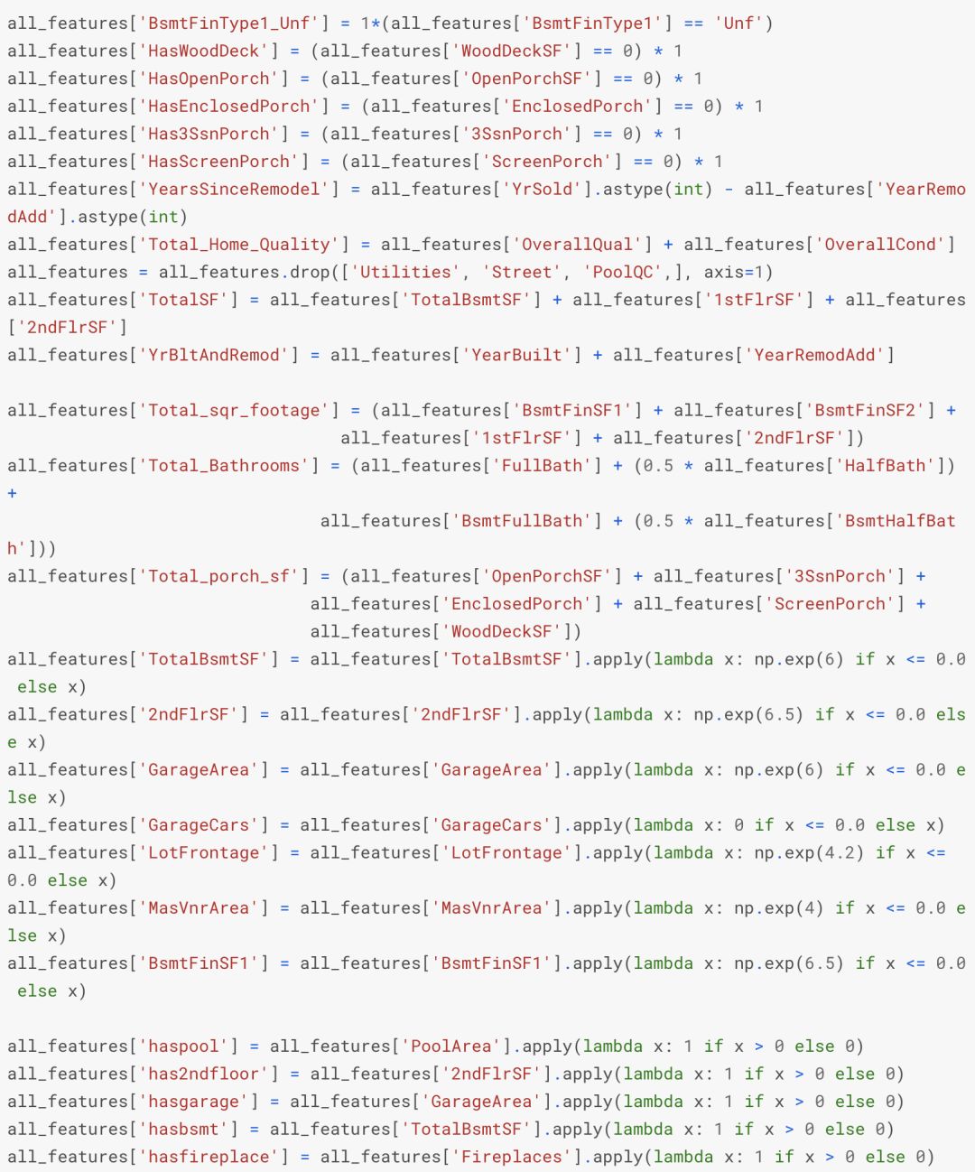 ML模型很难识别更复杂的模式,所以我们可以基于对数据集的直觉创建一些特征来帮助我们的模型,比如,每个房子地板总面积、浴室和门廊面积。