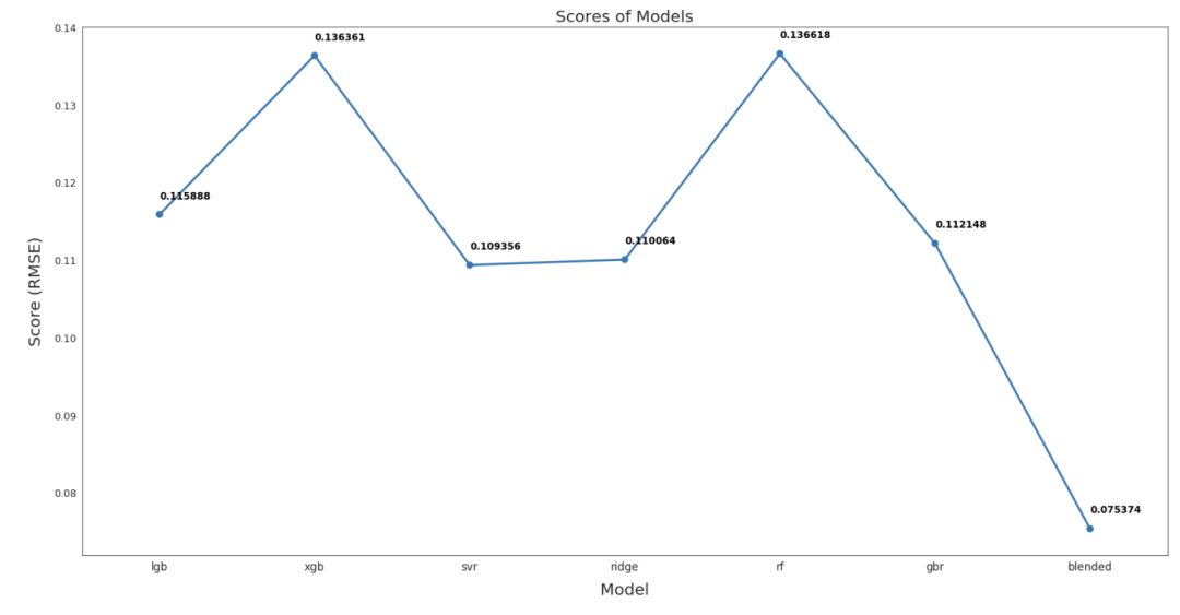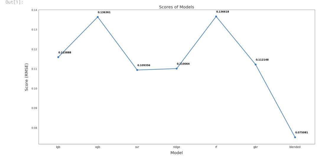 从下图可以看出,混合模型的RMSLE(均方根对数误差)为0.075,远优于其他模型。
