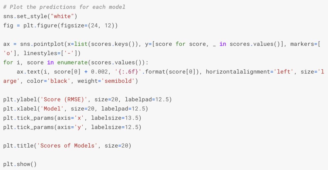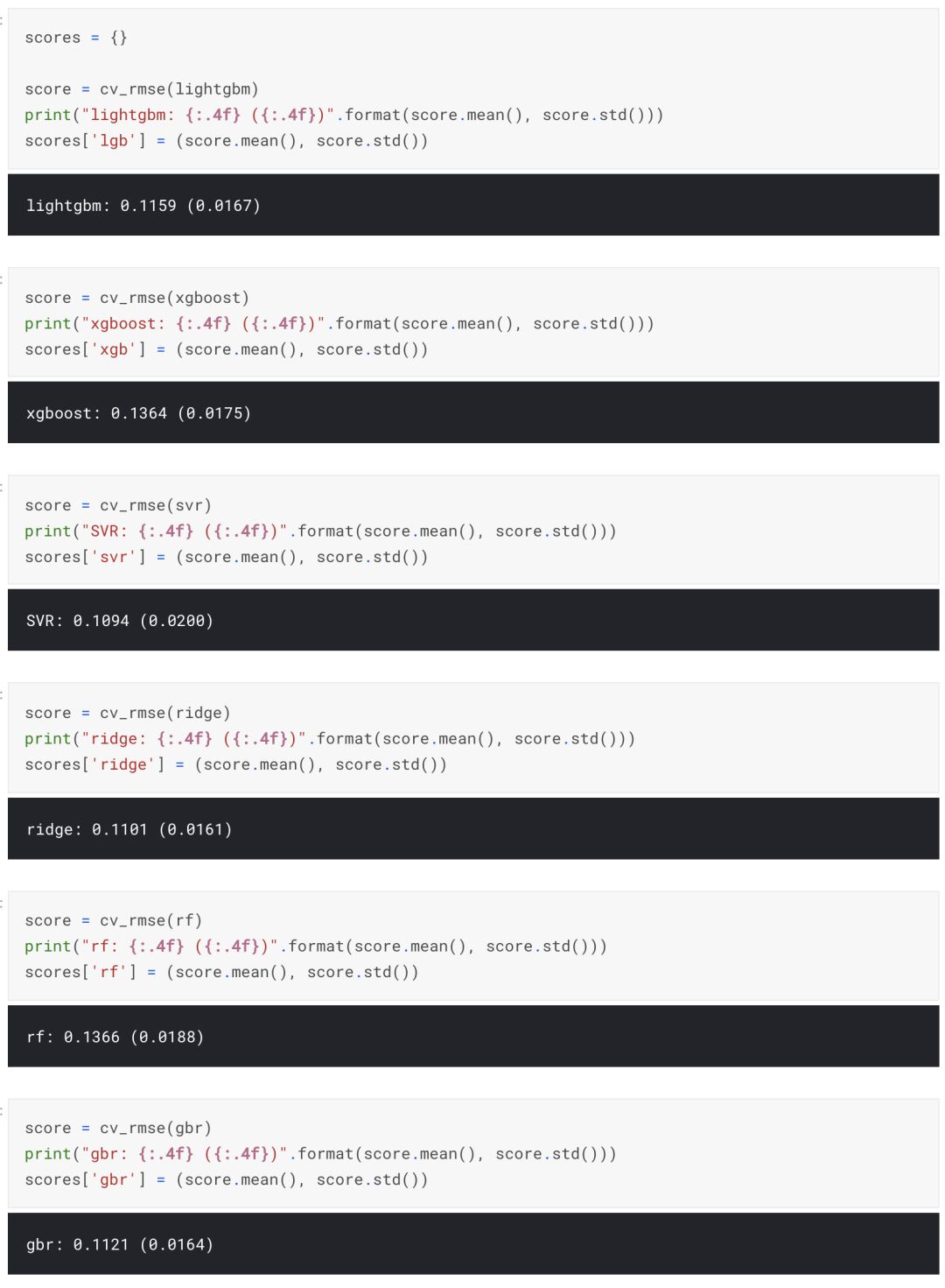 模型:每次交叉验证拟合7个模型(包括ridge、svr、gradient boost、random forest、xgboost、lightgbm regressors等)
