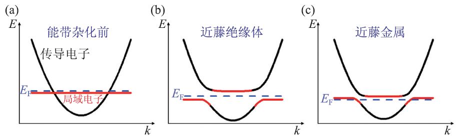 图1 传导电子与局域电子(a),在低温下杂化形成近藤绝缘体(b)或者近藤金属(c)