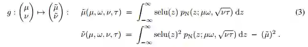 我们假设 xi 之间相互独立,并且有相同的均值µ 和方差 ν,当然独立性假设通常得不到满足。我们将在后面详细描述独立性假设。函数 g 将前一层神经网络激励值的均值和方差映射到下一层中激励值 y 的均值µ˜ = E(y) 和方差ν˜ = Var(y) 中: