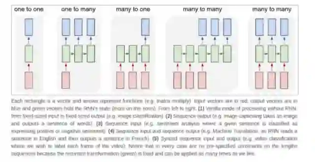 RNN可用于NLP、机器翻译、语言建模、计算机视觉、视频分析、图像生成、图像字幕等,这是因为在RNN中可以放置任意数量的输入和输出,并让它们一一对应、多对多对应。它架构存在多种形式,如图[5]所示。