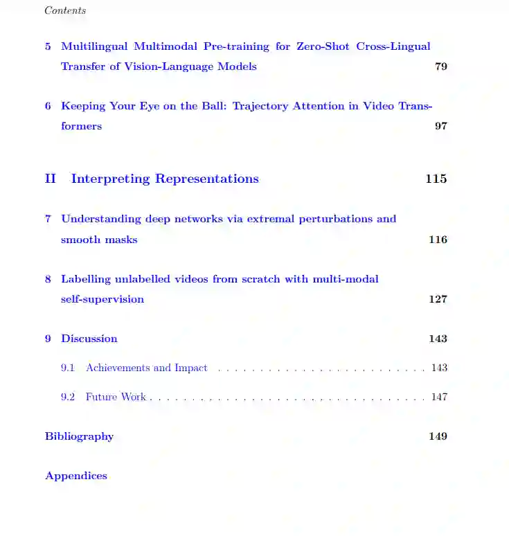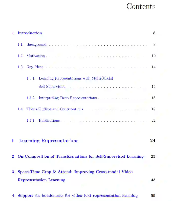 深度学习在多个领域都取得了突破性进展,从图像、语言和视频理解等核心机器学习任务,到医疗、自动驾驶和农业等现实行业。它的成功是通过为神经网络提供人工监督,从大型标记数据集(如ImageNet)自动学习分层数据表示。然而,获取大规模的标签数据通常是一个非常耗时和昂贵的过程。为应对这一挑战,本文挑战多模态视频数据的自监督极限。视频数据通常包含多种形式,如图像、音频、转录语音和可免费获得的文本标题。这些模态通常共享冗余语义信息,因此可以作为伪标签来监督彼此进行表示学习,而不需要使用人工标签。在不依赖标签数据的情况下,我们能够在从互联网收集的数百万个视频剪辑的非常大规模的视频数据上训练这些深度表示。通过在各种领域建立新的最先进的性能,展示了多模态自监督的可扩展性好处:视频动作识别、文本到视频检索、文本到图像检索和音频分类。我们还引入了数据转换、模型架构和损失函数方面的其他技术创新,以使用多模态自监督进一步改进对这些深度视频表示的学习。本文的第二个贡献是改进深度表示的可解释性的新工具,因为要破译这些深度表示中编码的关键特征是非常困难的。对于图像,我们展示了如何使用摄动分析来分析网络的中间表示。对于视频,我们提出了一种新的聚类方法,使用Sinkhorn-Knopp算法将深度视频表示映射到人类可解释的语义伪标签。本论文的研究成果为进一步提高深度视频表示学习的可扩展性和可解释性做出了贡献。