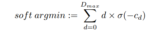 通常来说,我们是在cost volume中进行argmin操作,估算出cost volume的深度偏移量。然而,这种操作有两个问题:一、这是离散的,不能产生亚像素深度偏差估计;二、这不是差分的,因此不能够使用反向传播。为了克服这些限制,本文定义了soft argmin,一个完全的差分运算并且有产生平滑深度估计的能力。