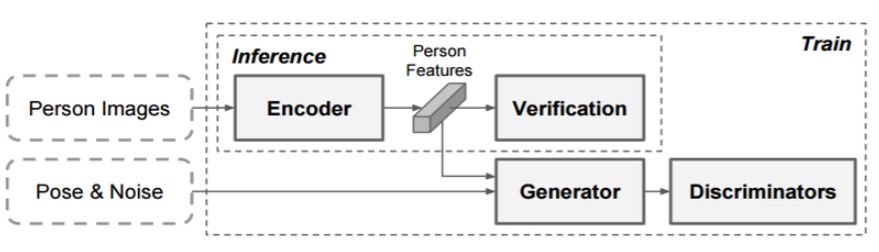 图 1:在姿势引导的图像生成器和判别器的帮助下训练得到的 FD-GAN 中的图像编码器,以学习鲁棒的身份相关和姿势相关表征。它在推断时不需要姿势信息和额外的计算成本。