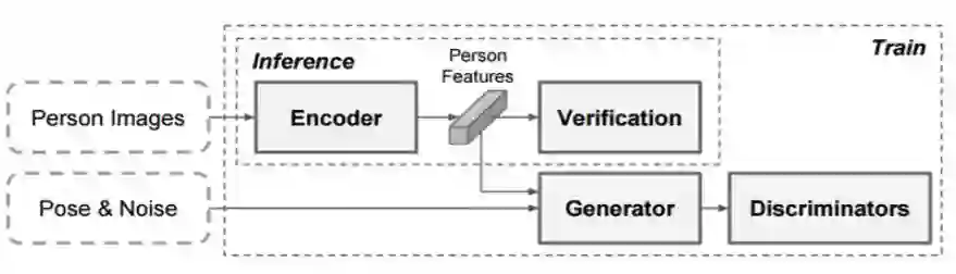 基于条件 GAN 的 DR-GAN[20] 也试着在面部识别任务中学习姿势变化的身份表征。它也用了一个带有判别器的编码器-解码器架构用来对两种身份进行分类。第 4.2 节中的结果证明,在行人重识别任务中,本文提出的方法比 DR-GAN 要好。
