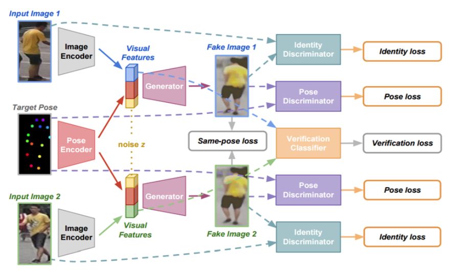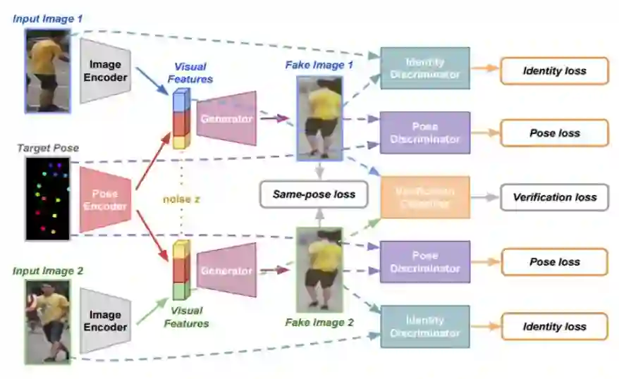 图 2:FD-GAN 的 Siamese 架构。利用验证损失,通过图像编码器 E 学习鲁棒的身份相关而姿势无关的特征,而生成假图像的辅助任务是为了骗过身份和姿势判别器的。引入新的同姿势损失项是为了进一步促进对与身份相关而与姿势无关的视觉特征的学习。