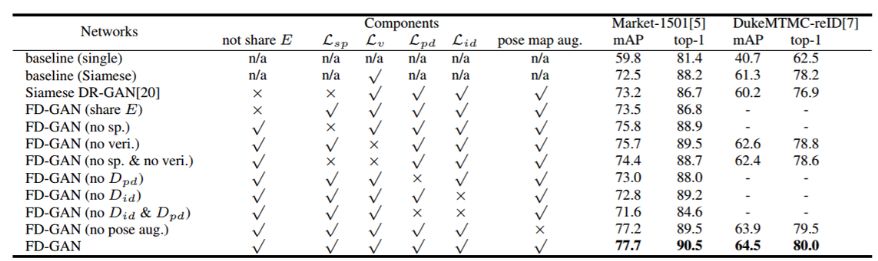 表 1:FD-GAN 在 Market-1501[5] 和 DukeMTMCreID[7] 数据集上的组分分析。表中标出了最高的准确率(%)和 mAP(%)。