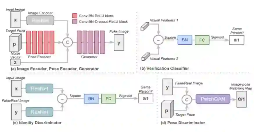 图 3:(a)生成器 G 和图像编码器 E 的网络架构;(b)验证分类器 V 的网络架构;(c)身份判别器 Did 的网络架构;(d)姿势判别器 Dpd 的网络架构。