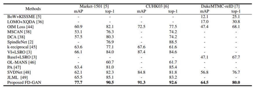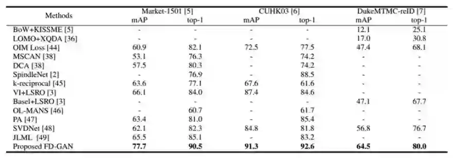 总体而言,本研究做出了以下贡献:1)我们提出了一个新的框架,FD-GAN,来学习与身份相关而与姿势无关的表征,用于姿势不同的行人重识别。与现有的对齐或基于区域的学习方法不同,我们的框架不需要额外的辅助姿势信息,在推断过程中也不需要增加计算的复杂程度。2)尽管在我们的框架中,行人图像生成是辅助任务,但是通过该框架生成的行人图像的质量比现有的行人图像生成方法所生成的图像都要好。3)在行人重识别任务中,本文提出的 FD-GAN 在 Market-1501[5],CUHK03[6] 以及 DukeMTMC-reID[7] 数据集上都取得了当前最佳的表现。