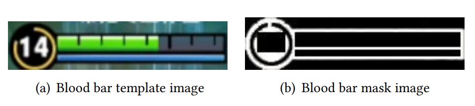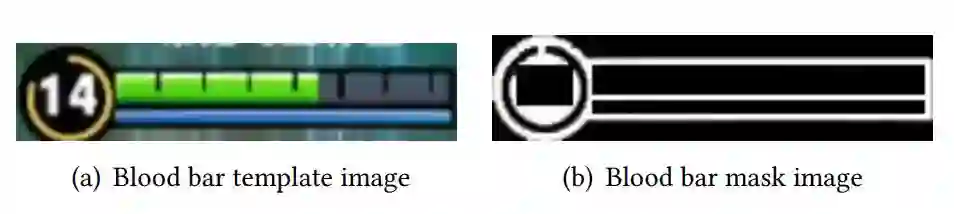 英雄检测采用的方法是利用一个预定义的模板对英雄血条进行匹配。由于不同血条的生命值、颜色、等级不同,因此必须利用掩码图像,来表示用于或不用于匹配的区域。图 1 为血条模板图像及其对应的掩码图像。(b 中白色表示可用于匹配的像素,黑色表示不用于匹配的像素。)