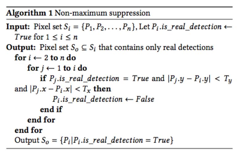 为了避免一个血条出现多个检测结果,研究者引入了非极大值抑制。在模板匹配阶段,研究者已经得到了得分排名前 20 的像素,而且已经对其做了降序排列。每个像素用 4 个属性 (x, y, score, is_real_detection) 进行描述。在非极大值抑制阶段,研究者设计了抑制算法,如下所示: