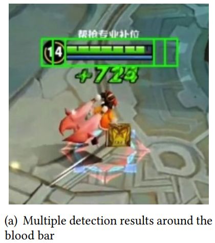 在这个游戏中,英雄的血条形状接近矩形,包含几条长水平线(如图 1 所示)。因此,在模板匹配步骤中,如果模板沿图像真实血条方向水平移动,则匹配结果不会大幅下降。因此,在真实血条周围通常会有多个检测结果,如图 4(a) 所示。