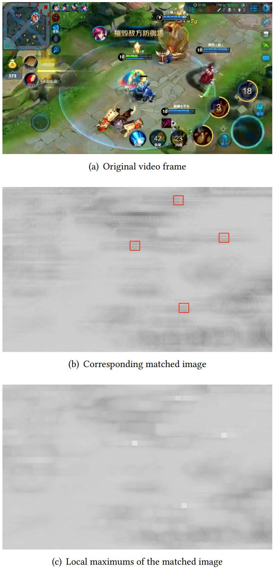 对于 3 通道的输入视频帧,研究者首先将其转换为灰度图,并在灰度图上执行模板匹配。匹配后的图像是一个 32 位浮点图像,每个像素表示输入图像与模板在该位置的匹配程度。研究者试图检测出一个视频帧中的所有英雄,但每个帧中的英雄数量是不确定的。因此,他们无法在匹配图像上应用一个固定的阈值,也无法将匹配的值进行排序并挑出前几个值。为了解决这个问题,他们对原始视频帧和对应的匹配图像进行了观察,如图 2 所示: