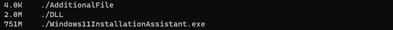 在将压缩包解压后,得到一个总大小为753MB的文件夹。其中可移植可执行文件Windows11 Installation Assistant.exe是压缩包里最大的的文件,大小为751 MB。
