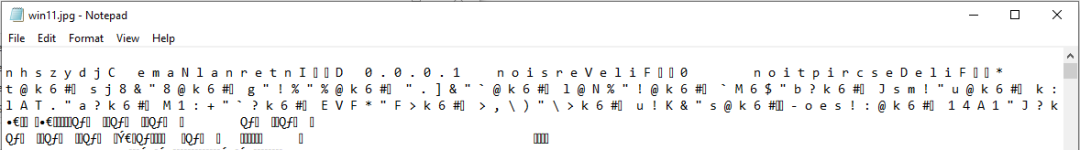 由于win11.jpg运行文件工具未能识别其文件类型,这就表明它被编码或加密了。然而,在文本编辑器中打开该文件,发现它的内容只是以相反的顺序存储了而已。