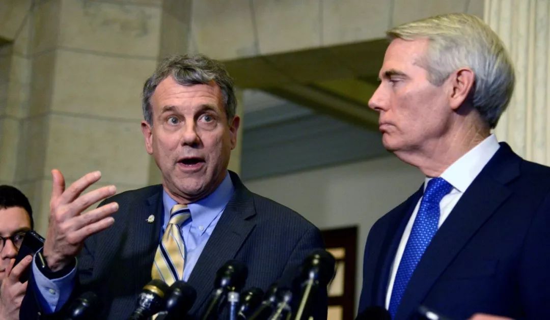 美国共和党参议员Rob Portman(右),上议院国土安全和政府事务常设调查小组委员会负责人,去年与民主党参议员Sherrod Brown在一起。两者都赞成限制中国人获得美国技术。