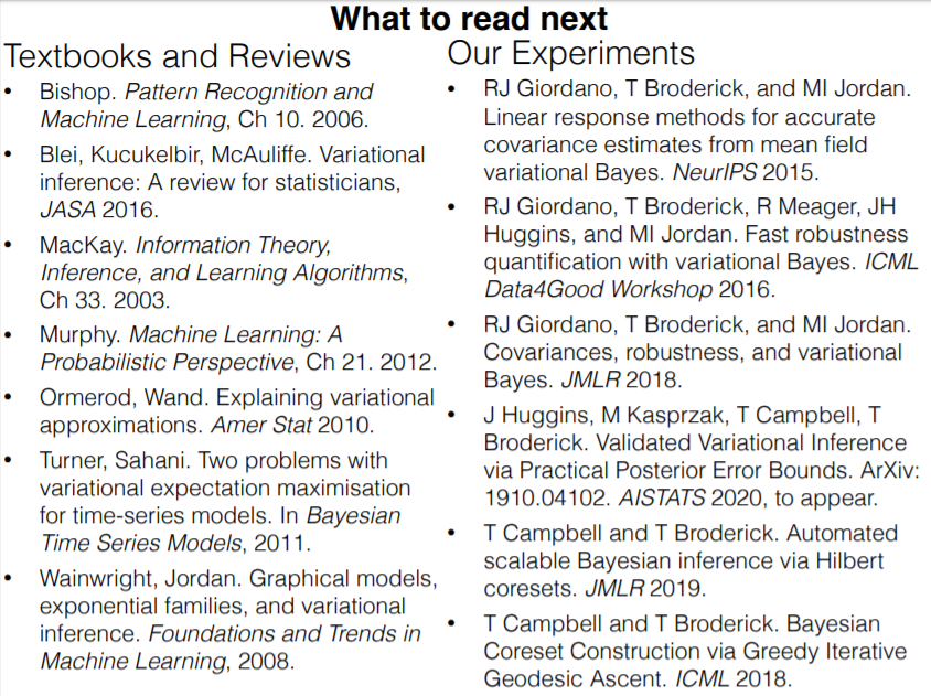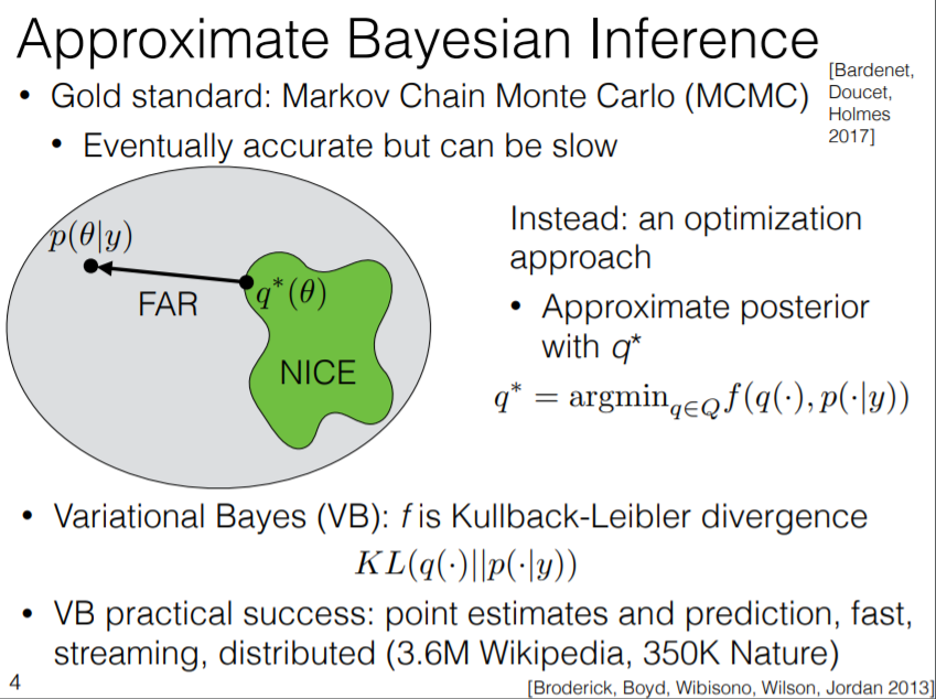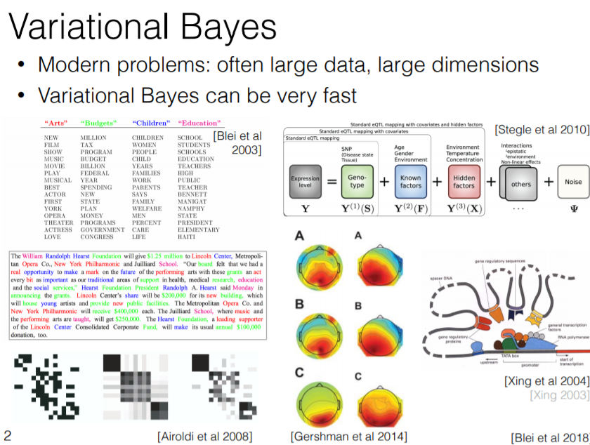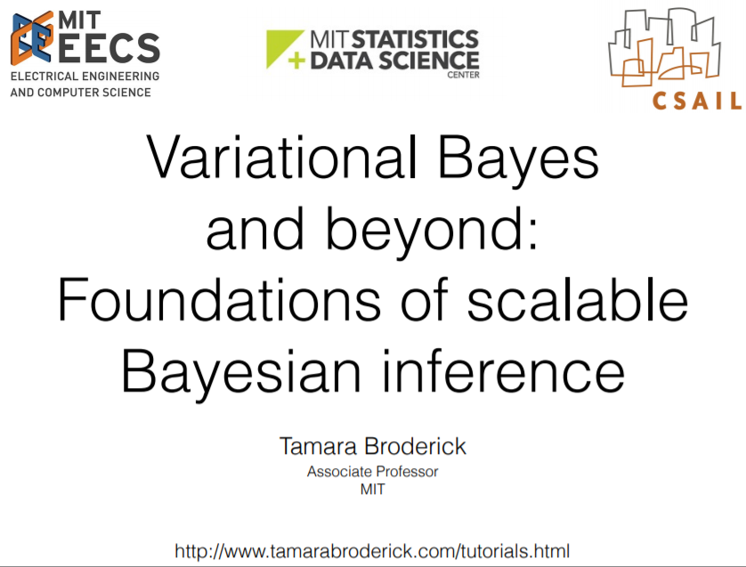 贝叶斯方法为现代数据分析提供了许多可取的特性,包括 (1)不确定性的一致性量化,(2)能够捕捉复杂现象的模块化建模框架,(3) 整合来自专家的先验信息的能力,以及(4)可解释性。然而,在实践中,贝叶斯推断需要对高维积分进行近似,而一些传统的算法为此目的可能会很慢——尤其是在当前感兴趣的数据规模上。本教程将介绍快速、近似贝叶斯推理的现代工具。“变分贝叶斯”(VB)提供了一个越来越流行的框架,它将贝叶斯推理作为一个优化问题提出。我们将研究在实践中使用VB的主要优点和缺点,重点关注广泛使用的“平均场变分贝叶斯”(MFVB)子类型。我们将注重能够让任何人使用VB,从数据分析师到理论家,都应该知道的属性。除了VB,我们还将简要介绍可扩展贝叶斯推理的最新数据汇总技术,这些技术在质量上有有限数据理论保证。我们将通过实际的数据分析实例来激发我们的探索,并指出该领域的一些开放问题。