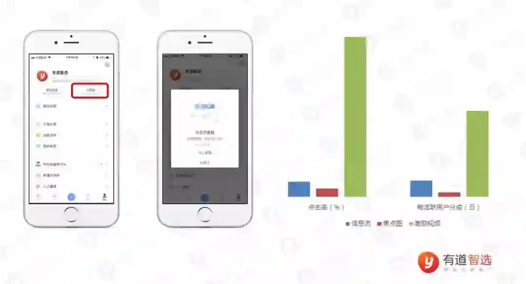 举个例子,下面是有道智选为独家资源有道云笔记设计的每日签到成功页的激励视频入口,签到功能显然是用户高频使用的场景。我们将这个位置的激励视频与首页信息流、焦点图进行变现效率对比,广告点击率与每日活用户创造的变现价值差异明显。
