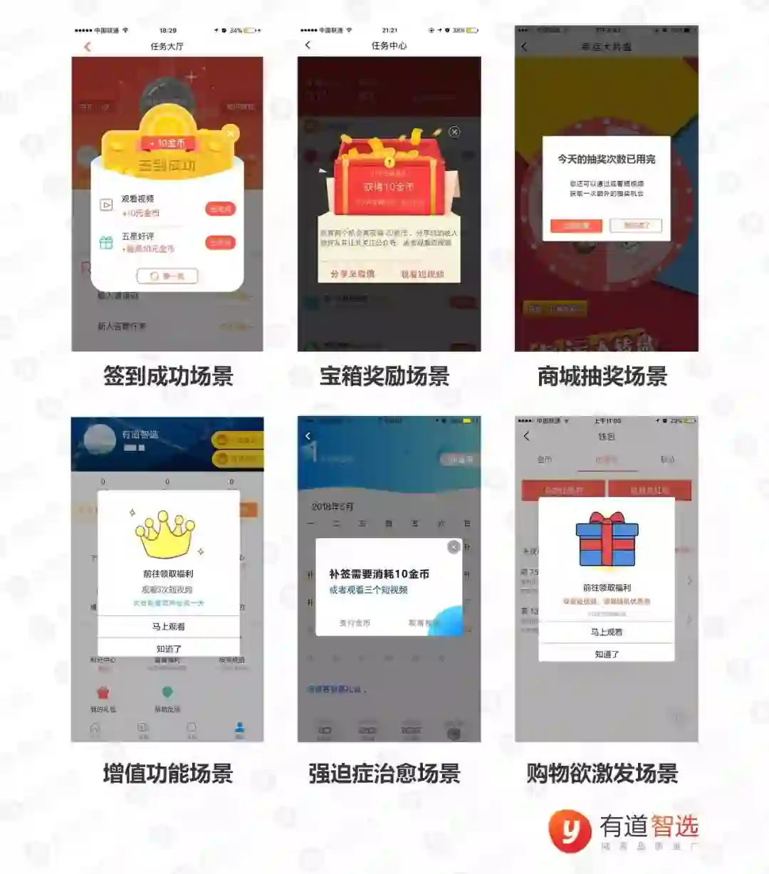 我们似乎不用把问题想得太复杂。用户在使用某项功能的时候,就能得到与该项功能相关的福利权益,那就是最好的情况。换句话说,激励视频广告的植入场景,应该与用户的产品使用场景完美统一。同时,尽量避免干扰用户对功能的正常使用。基于这些洞察,有道智选将合适的激励视频场景分成6类:签到成功场景、宝箱奖励场景、商城抽奖场景、增值功能场景、强迫症治愈场景以及购物欲激发场景。