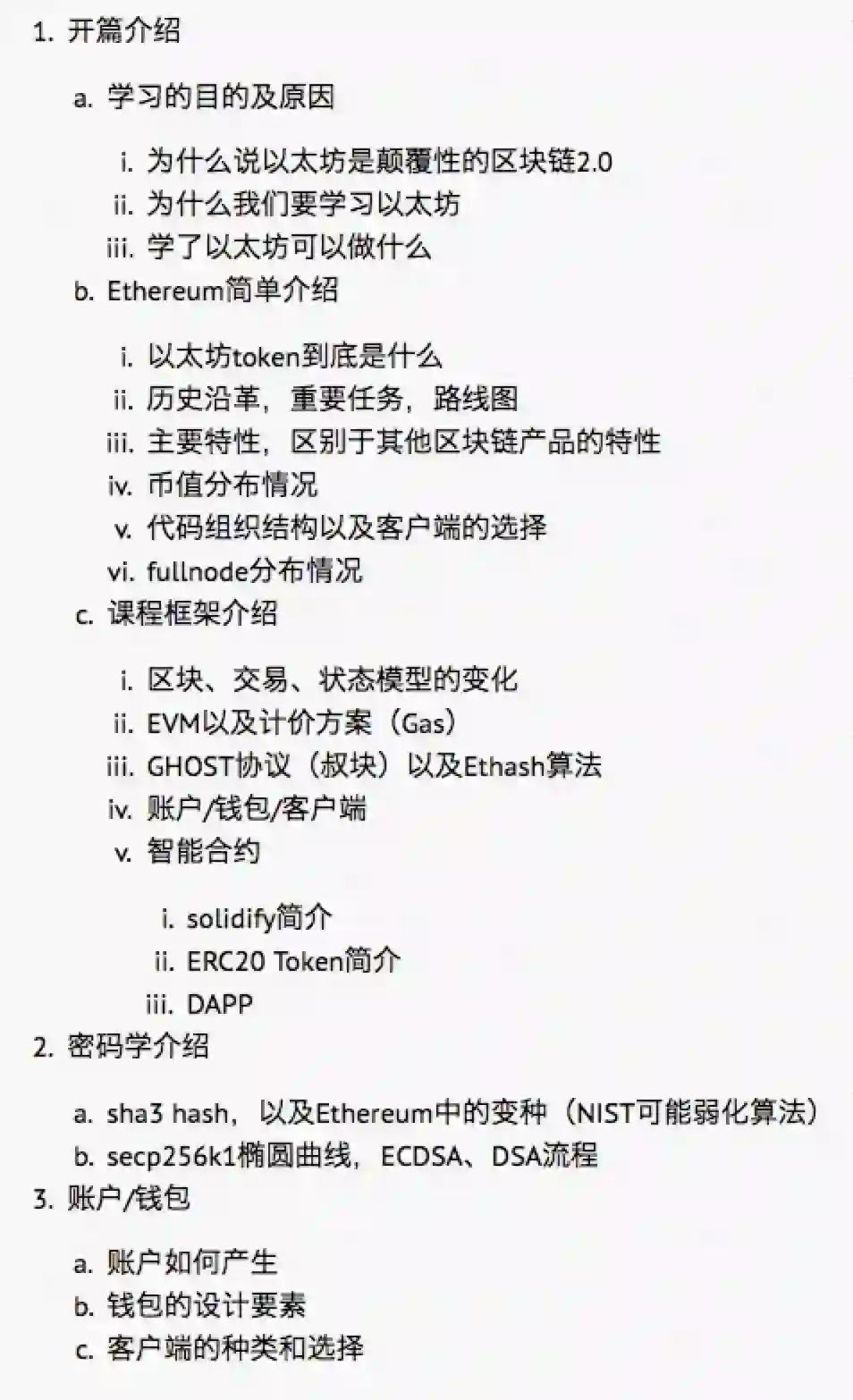 课程内容聚焦在Ethereum原理剖析,以及基于Ethereum的智能合约开发,同时会有实践带着大家一起实践代币开发和智能选举合约。正式课程推出之后,会根据实际情况有细微调整: