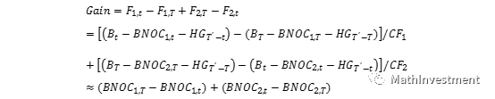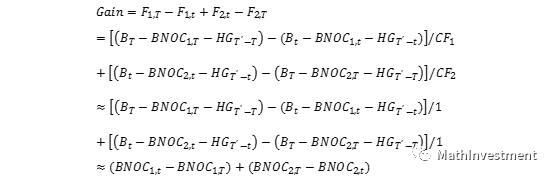 当t时刻发现近月合约被低估,远月合约被高估时,我们可以买入近月合约F(1,t),卖出远月合约F(2,t)。到T时刻,近远月合约价差变大,选择双向平仓而获利。关注私募工场ID:simugongchang,加私募工场老板娘微信guo5_guoguo。我们选择一可交割券,其在近月合约上的转换因子为CF1,在远月合约上的转换因子为CF2,那么整个套利过程的收益: