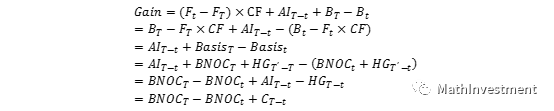 基差是持有收益与净基差之和,理论上,投资者买入基差,是买入了国债的持有收益与期货空头交割期权。假设t时刻构建1单位的基差多头,即买入1单位国债现货并卖出CF单位的期货,则至T时刻收益为(不考虑利息的在投资收入,下同):
