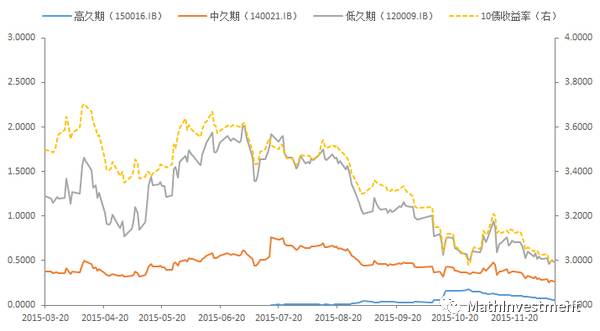 当收益率处于较高水平时,高久期国债为CTD券,但随着收益率的下行,在合约到期日,CTD发生切换的概率会越来越大,其转换期权的价值也会越来越高,例如T1512的高久期可交割券150016.IB,其转换期权的价值随着收益率的下行而上升。