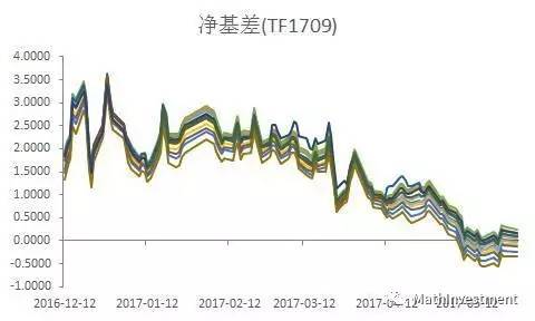 该差值小于零表示期货表现弱于现货,投资者对未来相对悲观,情绪较差,举例来说,CTD券170010.IB的收益率在2017/5/31收益率下行3.99BP,那么期货合约表现强于现货,相对强度为-3.99-(-5.63)=1.64BP。