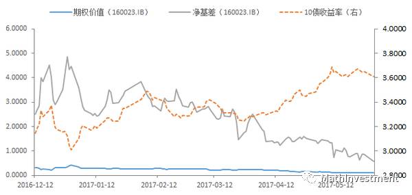 当转换期权价值下降且市场情绪较好时,净基差的两个组成部分均下降,最终推动净基差变小。关注私募工场ID:simugongchang,加私募工场老板娘微信guo5_guoguo。以T1706合约的高久期可交割券160023.IB为例,在2017年1月-5月期间,收益率快速上行并远离3%,160023.IB的转换期权价值逐渐下降,另外,市场情绪逐渐变好,期货强于现货,“除权后净基差”也呈现下降趋势。转换期权价值和“除权后净基差”的同时下降推动了净基差的变小。