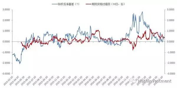 图11:期现货相对强弱与除权后净基差走势图(T合约)