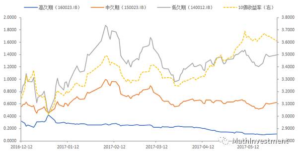 在实际投资中,常常会运用到这样一个经验法则:当收益率高的时候,高久期国债容易成为CTD券;当收益率低的时候,低久期国债容易成为CTD券;当收益率处于中间水平时,中久期国债容易成为CTD券。