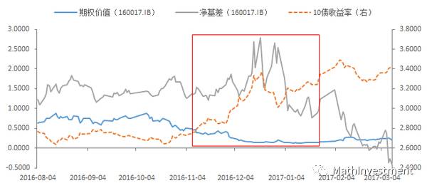 图7:高久期券的转换期权价值与净基差走势图(T1703-160017.IB)