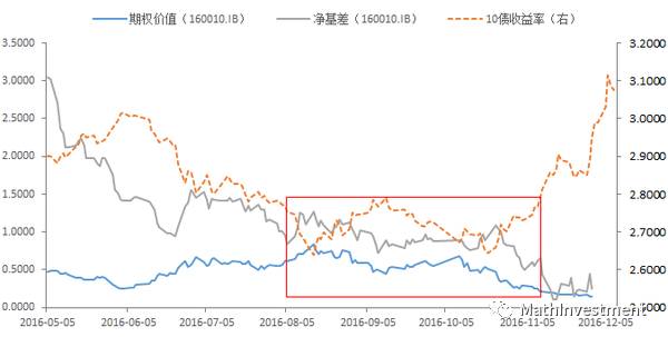 再比如,对于T1612合约的高久期券160010.IB来说,当收益率低于3%时,其转换期权价值较大。从具体时间段来说,在2016/7/20-2016/11/10期间,十年期国债收益率处于2.8%下方,160010.IB的转换期权价值均值为0.5442,净基差均值为0.9577,转换期权价值占比56.82%,两者走势高度相关。