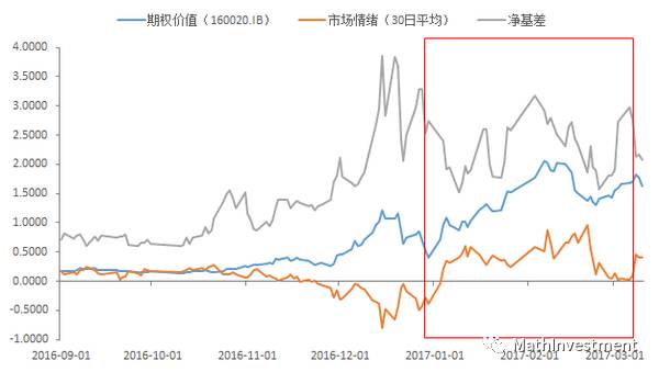 “除权后净基差”基于市场情绪的策略执行区间是2016/6/24-2017/3/10,总计173个交易日,累计收益率3.95%。从策略的结果表现来看,该策略在前期“牛皮市”中表现一般,但在后期,策略净值随着“除权后净基差”的大幅波动而上升,说明其很好地抓住了“除权后净基差”的趋势性变化,即期现货相对强弱的趋势性变化与“除权后净基差”的趋势性变化是一致的。