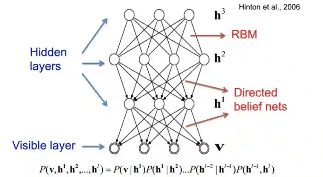 DBN由多个限制玻尔兹曼机(Restricted Boltzmann Machines)层组成,一个典型的神经网络类型如图所示。这些网络被“限制”为一个可视层和一个隐层,层间存在连接,但层内的单元间不存在连接。隐层单元被训练去捕捉在可视层表现出来的高阶数据的相关性。