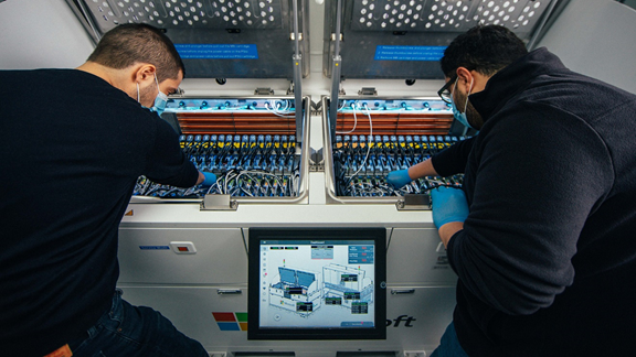 图为 Azure 首席软件工程师 Ioannis Manousakis(左),与微软数据中心高级开发团队首席硬件工程师Husam Alissa(右)正在检查位于微软数据中心的两相浸入式冷却槽