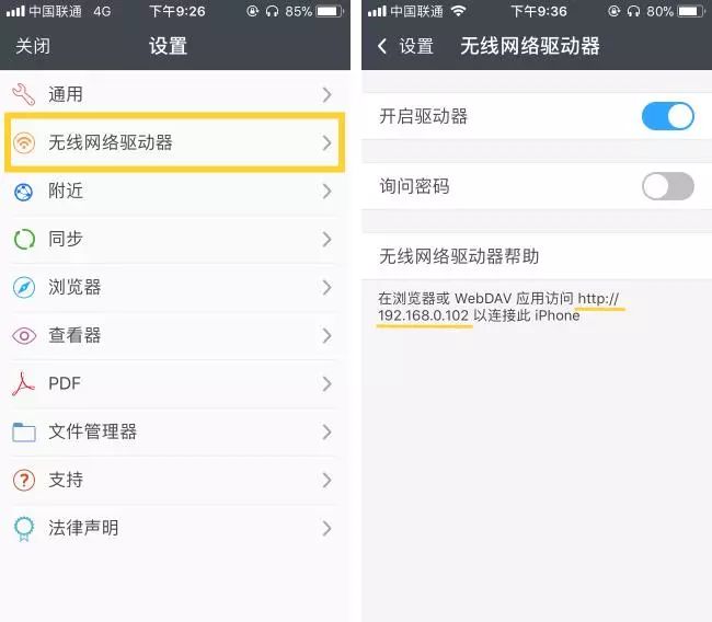 Documents 其实还有一项非常实用的局域网文件共享功能。在设置界面中进入「无线网络驱动器」,开启驱动器开关后,只要在同一局域网环境下(比如同一 Wifi )使用浏览器或者支持 WebDAV 的应用内访问指定链接网址,任何设备都能连接并读取 Documents 内的内容。