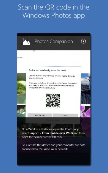 不过由于这项功能目前处于预览版测试,默认没有开启,你需要先在「照片」应用中找到「设置」,然后打开「预览」下「帮助 Microsoft 测试通过 WLAN 进行移动导入的功能」,照片应用的「导入」菜单中就会出现选项「通过 WLAN 从移动设备导入」了,点击后用移动端 App 扫描二维码即可完成配对进行传输了。