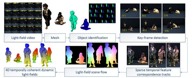 由于光场在捕获静态场景时需要大量的视点,从而就会产生大量的数据。最近,在虚拟现实和增强现实(VR / AR)的沉浸式内容应用上发现,摄像机阵列也可以用来获得光场的动态场景,但是传统的视频编辑技术又不适合编辑这些数据,因为在多个离散视图形成的光场中存在编码空间和时间的冗余。在本文中,作者提出了一种时空相干动态光场影像的研究方法,如图1所示。这使得使用了沉浸式VR的光场影像技术得到了广泛运用。