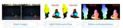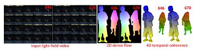 最近光场影像技术发展迅猛,由于它能增加场景的真实感和沉浸感,在一些虚拟现实和增强现实领域(VR / AR)得到越来越广泛地应用。但是局限于一些稠密场景表示的特殊需要,现有的光场方法通常仅限于静态场景的表达,而且与传统影像相比,由于缺乏大量的数据和方法,用光场影像技术来推断时间相干性在存储、压缩和编辑等方面仍然面临着重大挑战。在本文中,作者提出了一种提取时间相干光场影像的表示方法,这种方法从一个光场相机阵列来获得极线平面图像(EPIs),这里极线平面图像(EPIs)是通过约束场景流的估值来获得四维时间相干的动态光场的一种表示方法,这种方法在多种光场数据集上验证了时间的相干性。如图所示。